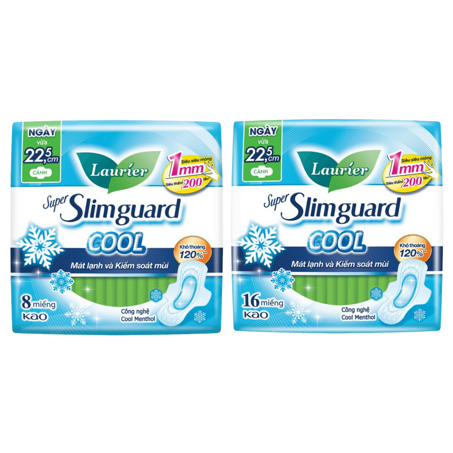 Băng vệ sinh bạc hà mát lạnh có cánh Laurier Super Slimguard Cool 22.5cm mang đến cảm giác cool mát và giúp kiểm soát mùi chỉ với 1mm siêu mỏng. Đột phá với công nghệ Cool menthol từ Nhật Bản, mát lạnh tức thì và không hầm bí suốt ngày dài.