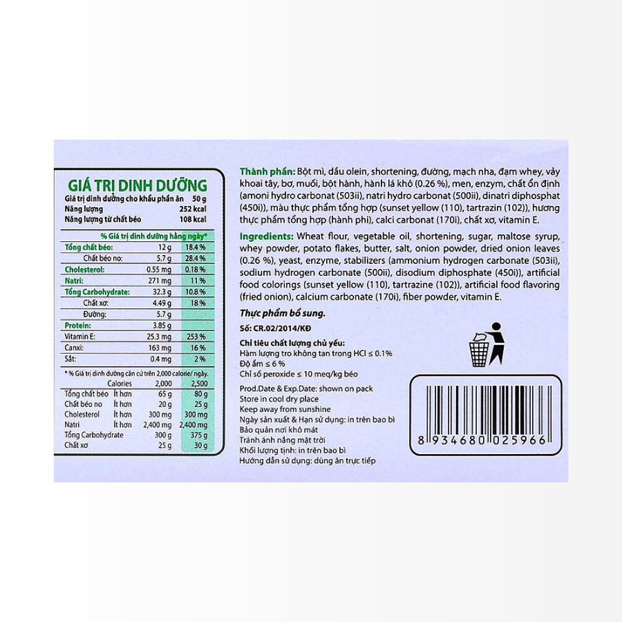 Thành phần: Bột mì, dầu thực vật (dầu cọ), shortening (dầu cọ), đường, chất xơ, mạch nha, chất béo thay thế bơ, bột whey, chất tạo xốp (amoni hydro carbonat (503ii), natri hydro carbonat (500ii)), muối, bột hành (0.8%), bột nếp, vảy khoai tây, calci carbonate (170i),... Dùng trực tiếp. Bảo quản nơi khô ráo, thoáng mát