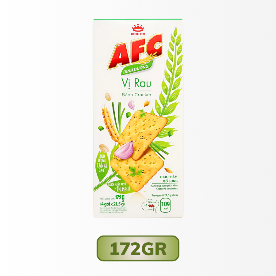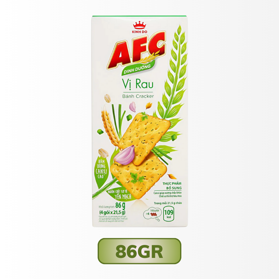 Trong bánh quy AFC vị rau chứa nhiều dưỡng chất như chất xơ, chất béo, chất đạm, các khoáng chất và vitamin cần thiết.