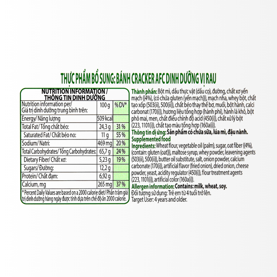 Thành phần dinh dưỡng trong Bánh cracker vị rau AFC Dinh Dưỡng hộp 200g