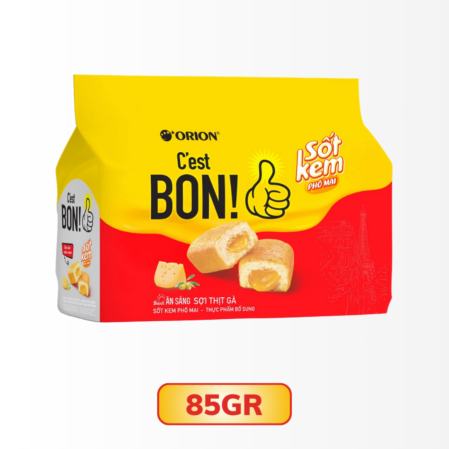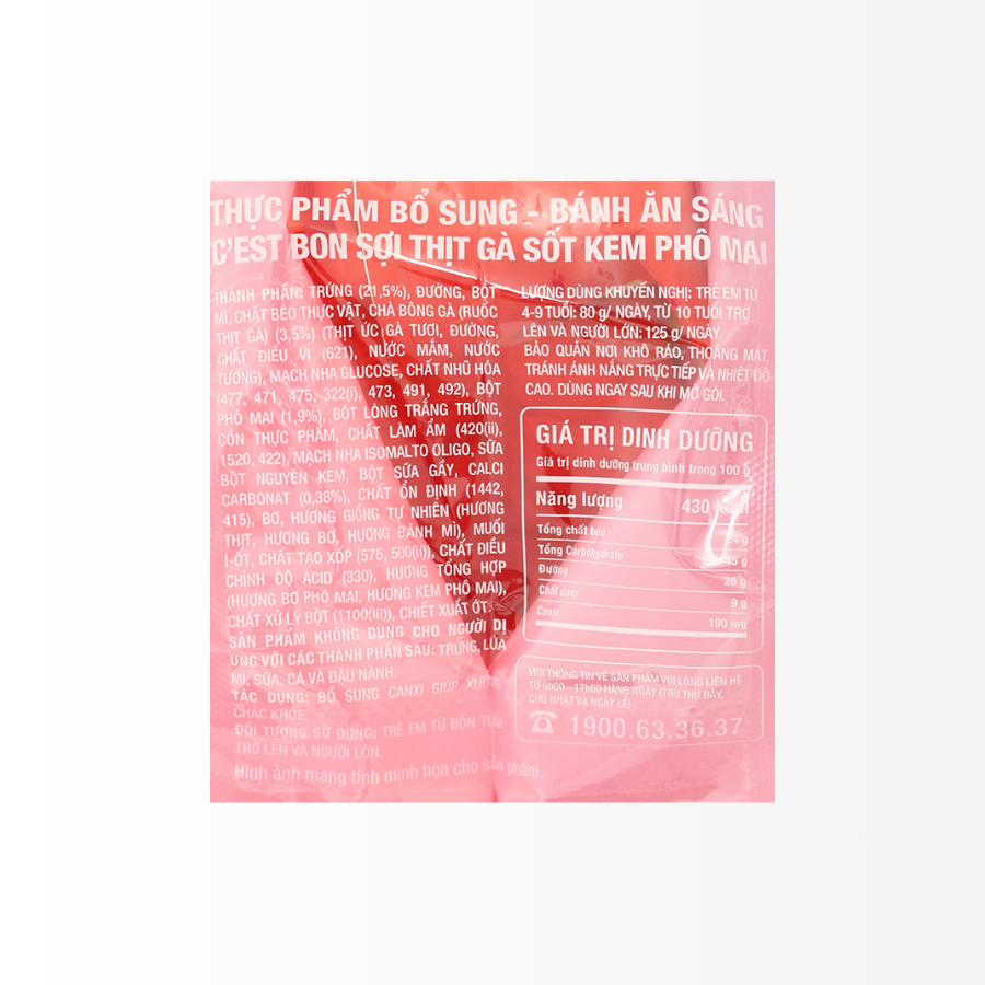 Bánh Ăn Sáng C'est Bon Kem Phô Mai Sợi Thịt Gà được đóng bao bì dạng gói tiện lợi có thể mang đi dã ngoại, đi học, đi làm, cung cấp dinh dưỡng cho cơ thể.
