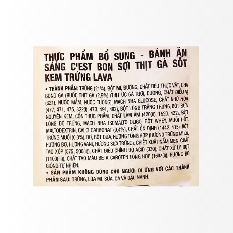 Thành phần: Trứng (25%), bột mì, đường, dầu thực vật, chà bông gà (ruốc thịt gà) 5.1% - thịt ức gà tươi, đường, chất điều vị (621, 627, 631) nước mắm, nước tương, muối i-ốt - glucose syrup, chất nhũ hoá, bột lòng trắng trứng, cồn thực phẩm, chất giữ ẩm, isomalto oligo syrup, chất ổn định, muối i-ốt, bột chiết xuất nấm men, bơ, hương tổng hợp, chất tạo xốp, chất điều chỉnh độ acid, sắt, chất chống đông vón, chất mang.