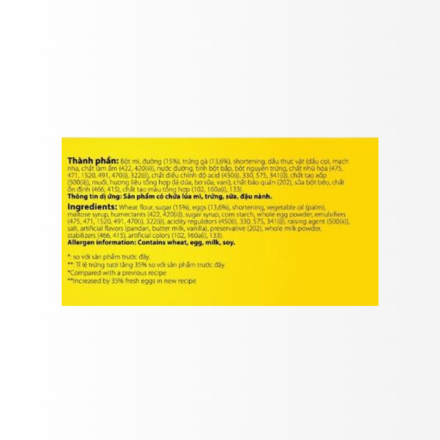 Bột mì, đường, shortening, trứng gà, dầu cọ, nước đường fructose, mạch nha, chất giữ ẩm, bột bắp, bột nguyên trứng, chất nhũ hoá, sữa tươi, hương thực phẩm tổng hợp,... |