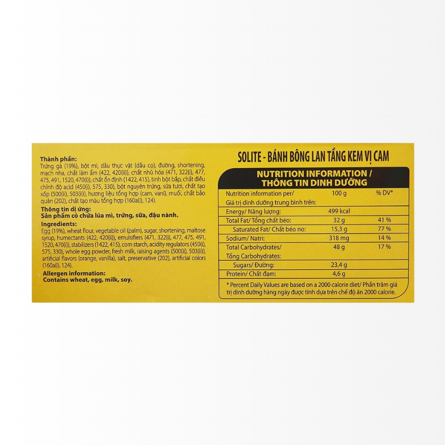Thành phần dinh dưỡng: Bánh bông lan tầng kem vị cam Solite được làm từ các nguyên liệu chất lượng như bột mì, đường, trứng gà tươi, dầu thực vật,... Sản phẩm sử dụng những nguyên liệu đảm bảo an toàn cho người sử dụng.