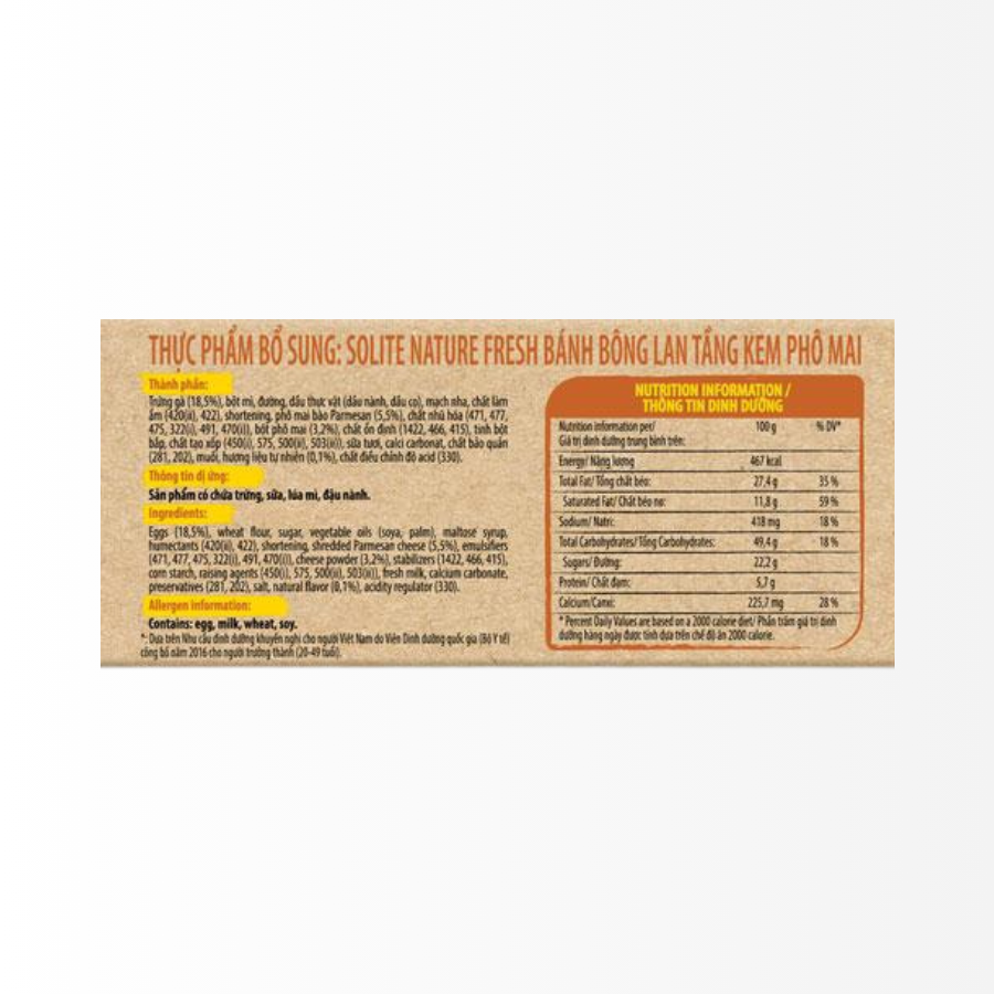 Trứng gà (18,5%), bột mì, đường, dầu thực vật (dầu nành, dầu cọ), mạch nha, chất làm ẩm, shortening, phô mai bào Pamesan (5.5%), chất nhũ hóa, bột phô mai (3.2%), chất ổn định, tinh bột bắp, chất tạo xốp, sữa tươi, calci cacbonat, chất bảo quản, muối, hương liệu tự nhiên (0.1%), chất điều chỉnh độ acid... |