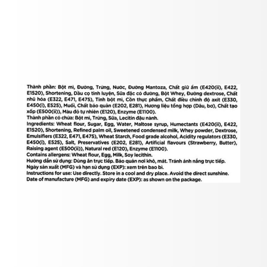 - Thành phần : Bột mì, đường, trứng, bột dâu, sữa bột, dầu thực vật,…