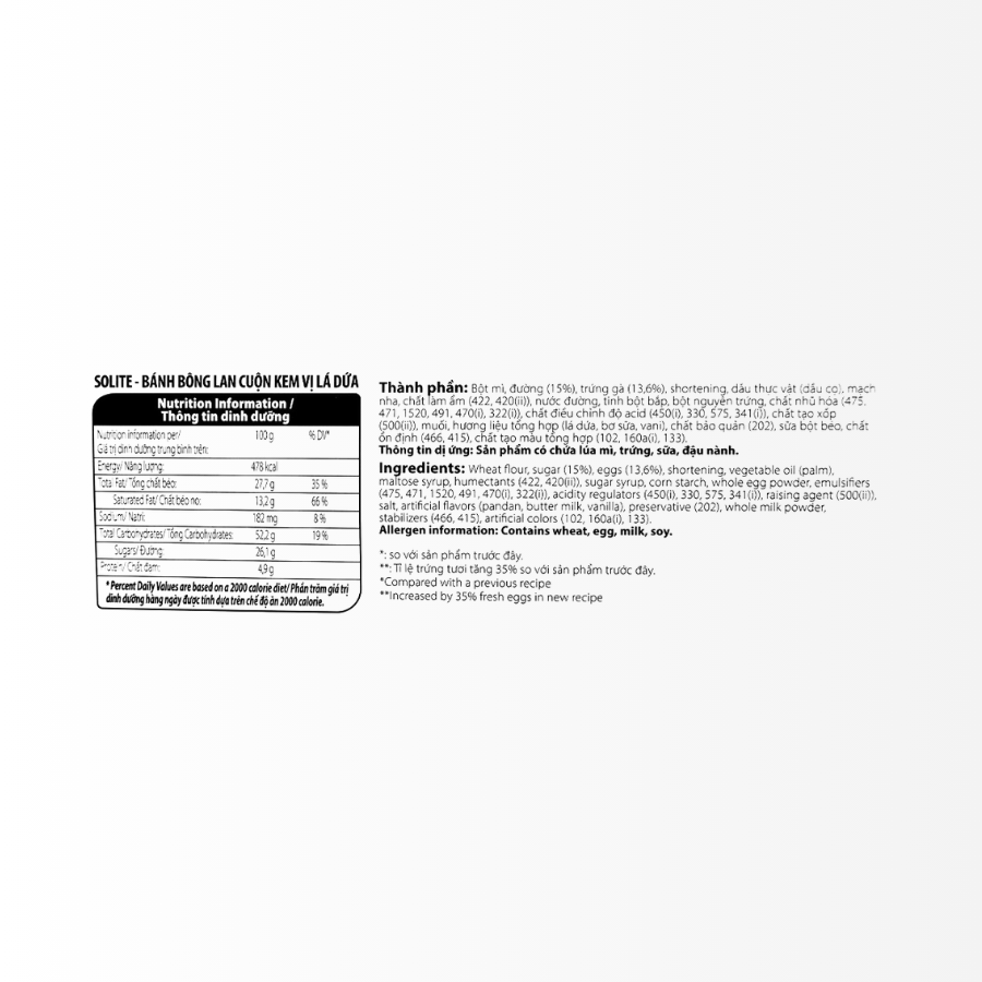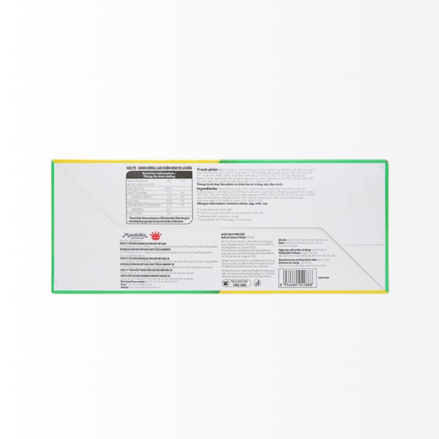 Bánh Bông Lan Tròn Solite Kem Vị Lá Dứa mang đến hương vị thơm ngon, mềm mịn hòa quyện giữa lớp bánh bông lan xốp nhẹ và nhân kem lá dứa thơm, béo.