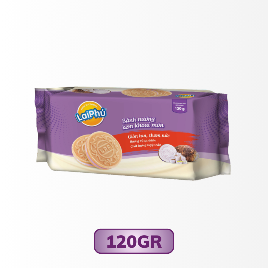 Kết hợp giữa vỏ bánh giòn tan được làm từ lúa mì thượng hạng cùng với lớp kem Khoai Môn ngọt bùi, Bánh Cookies Lai Phú Kem Sầu Khoai Môn 120G là sự cân bằng hoàn hảo giữa hương vị khoai môn bùi bùi của sầu kết hợp với vỏ bánh mỏng giòn, đem mang đến một trải nghiệm hoài hảo cho vị giác của bạn.
