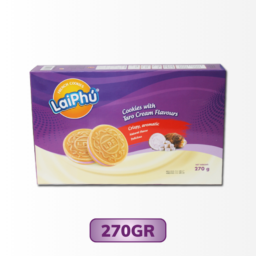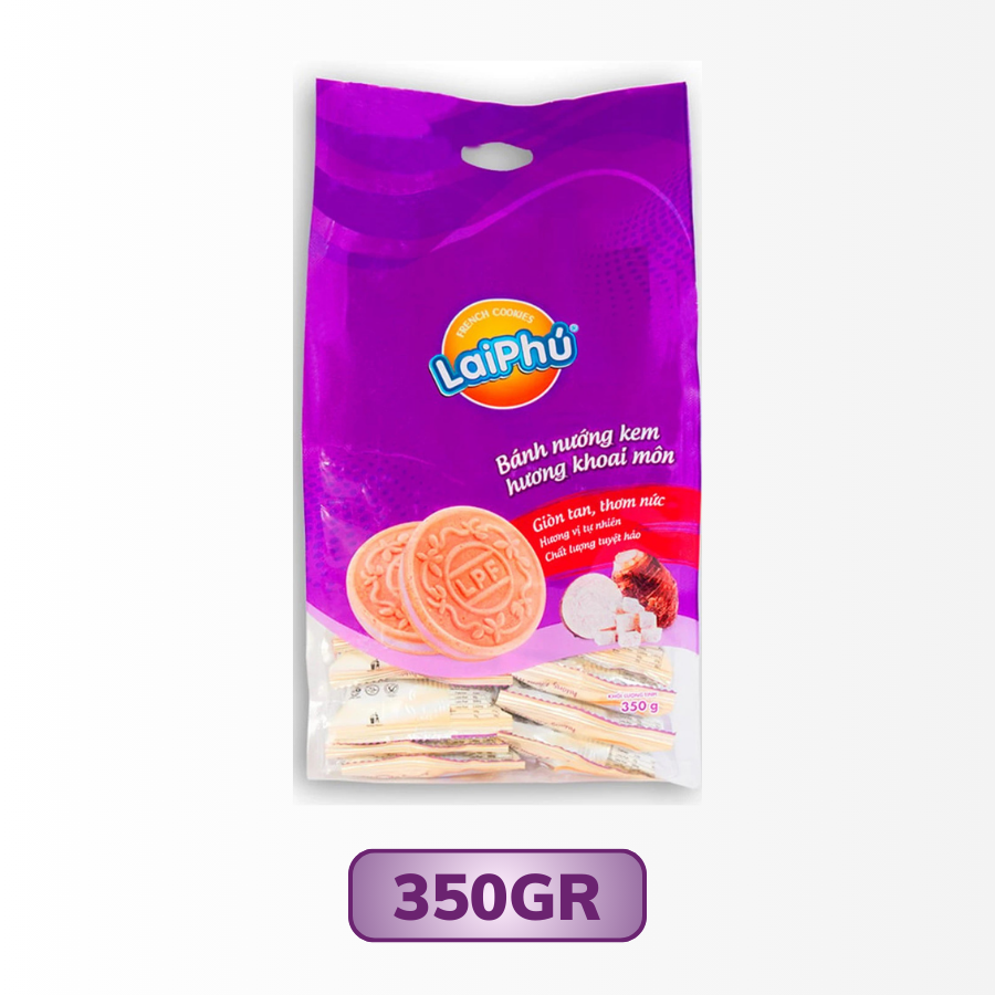 Được làm từ lúa mì thượng hạng, Cookies Lai Phú Kem Khoai Môn là một lựa chọn tuyệt vời để giúp bạn bổ sung dinh dưỡng cho cơ thể, tiếp thêm năng lượng cho một ngày năng động. Nhân bánh được làm từ kem Khoai Môn với tỷ lệ chuẩn xác, giữ trọn mùi hương đặc trưng từ khoai môn khiến bạn ấn tượng ngay từ lần đầu thưởng thức. Bánh có hình dạng tròn, nhỏ, dễ cầm.