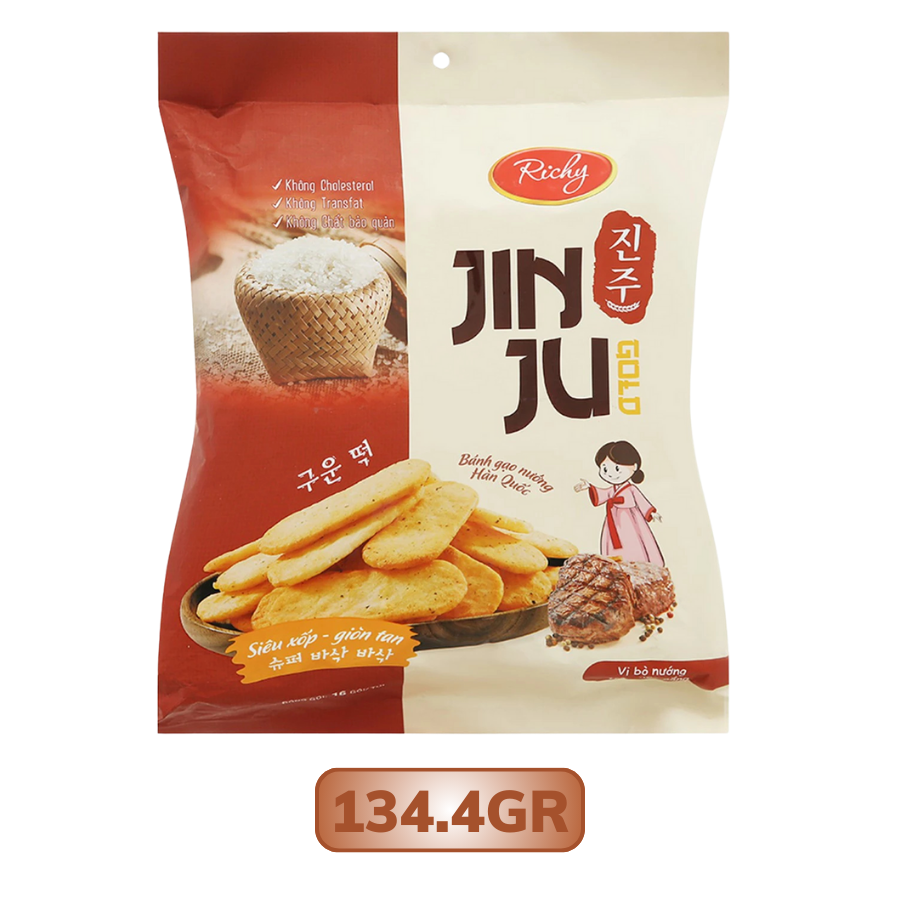 Bánh gạo giòn, thơm ngon, nhai rộp rộp kích thích vị giác. Bánh gạo vị bò nướng tiêu một nắng Richy Jinju Gold gói 134.4g với vị bò nướng tiêu một nắng kích thích vị giác, thích hợp để ăn vặt, hoặc sử dụng trong những buổi tiệc ngọt. Bánh gạo Richy thơm ngon, hấp dẫn ăn nhiều không ngán.