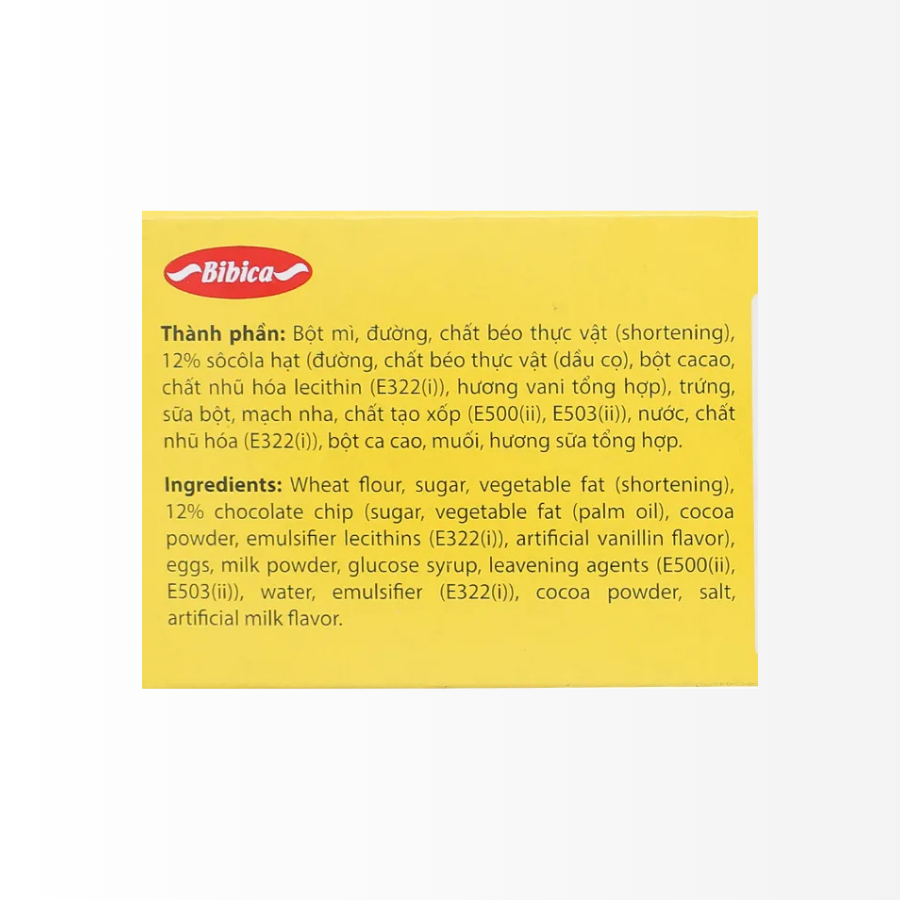 Thành phần: Bột mì, đường, chất béo thực vật, 9% sôcôla hạt, trứng, sữa bột, mạch nha, 12% socola hạt/ 2% nho khô/ 2% hạt điều/ 2% cơm dừa, chất tạo xốp (E500ii, E503ii), chất nhũ hóa (E322i), bột ca cao, muối, hương sữa tổng hợp.