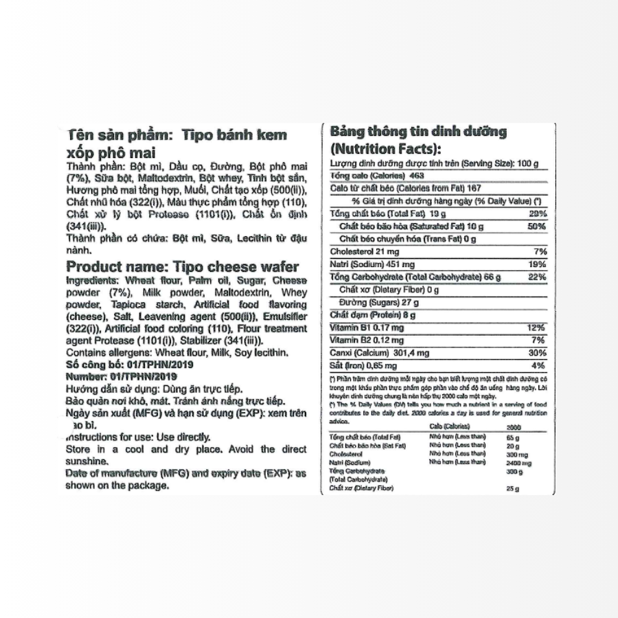 Bánh kem xốp phô mai Tipo 180g có chứa những thành phần dinh dưỡng như: Calo, chất béo bão hòa, natri, chất xơ, đường, chất đạm, và các Vitamin B1, B2, canxi, sắt,... Trong đó, 100g Bánh kem xốp phô mai Tipo có chứa khoảng 463 kcal.