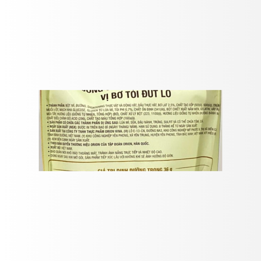 Bột mì, đường, chất tạo xốp, trứng, muối i_ốt, mạch nha gulcose, gluten từ lúa mì, tỏi phi, chất ổn định, bột chiết xuất nấm men, gelatin, vảy rau mùi tây, hương liệu, chất xử lý bột, chất tạo màu,...