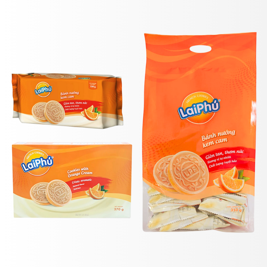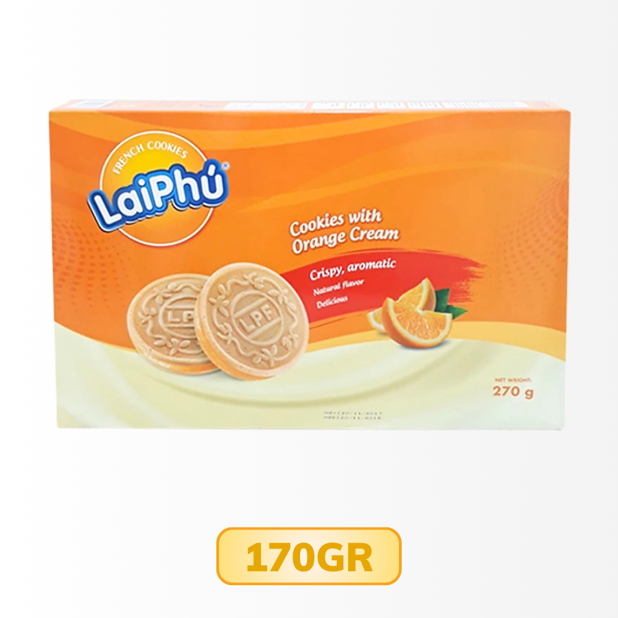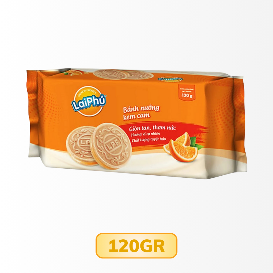 Được làm từ lúa mì thượng hạng, Cookies Lai Phú Kem Cam là một lựa chọn tuyệt vời để giúp bạn bổ sung dinh dưỡng cho cơ thể, tiếp thêm năng lượng cho một ngày năng động. Nhân bánh được làm từ kem Cam với tỷ lệ chuẩn xác, tạo nên một hương vị chua ngọt dịu nhẹ, dễ ăn mà lại thơm ngon khó cưỡng. Bánh có hình dạng tròn, nhỏ, dễ cầm.
