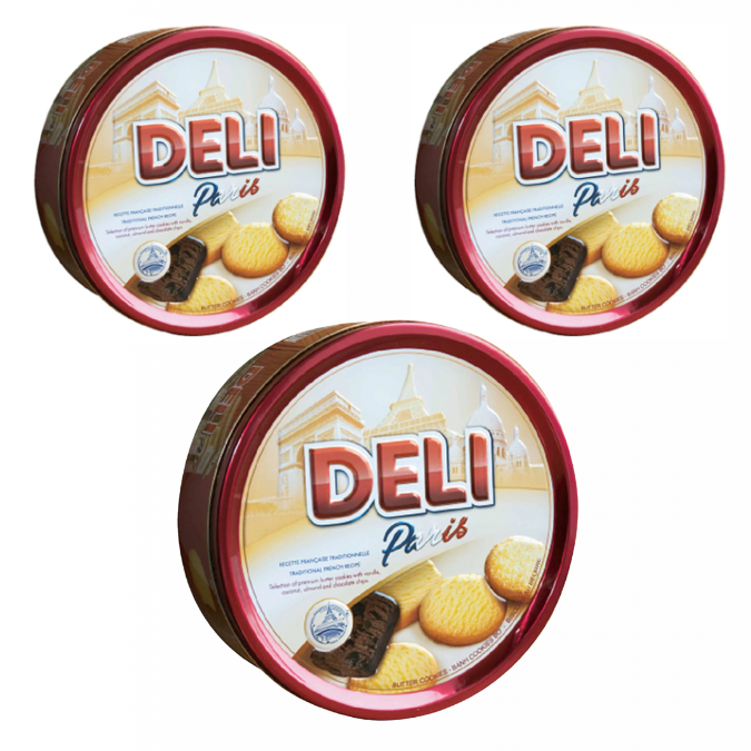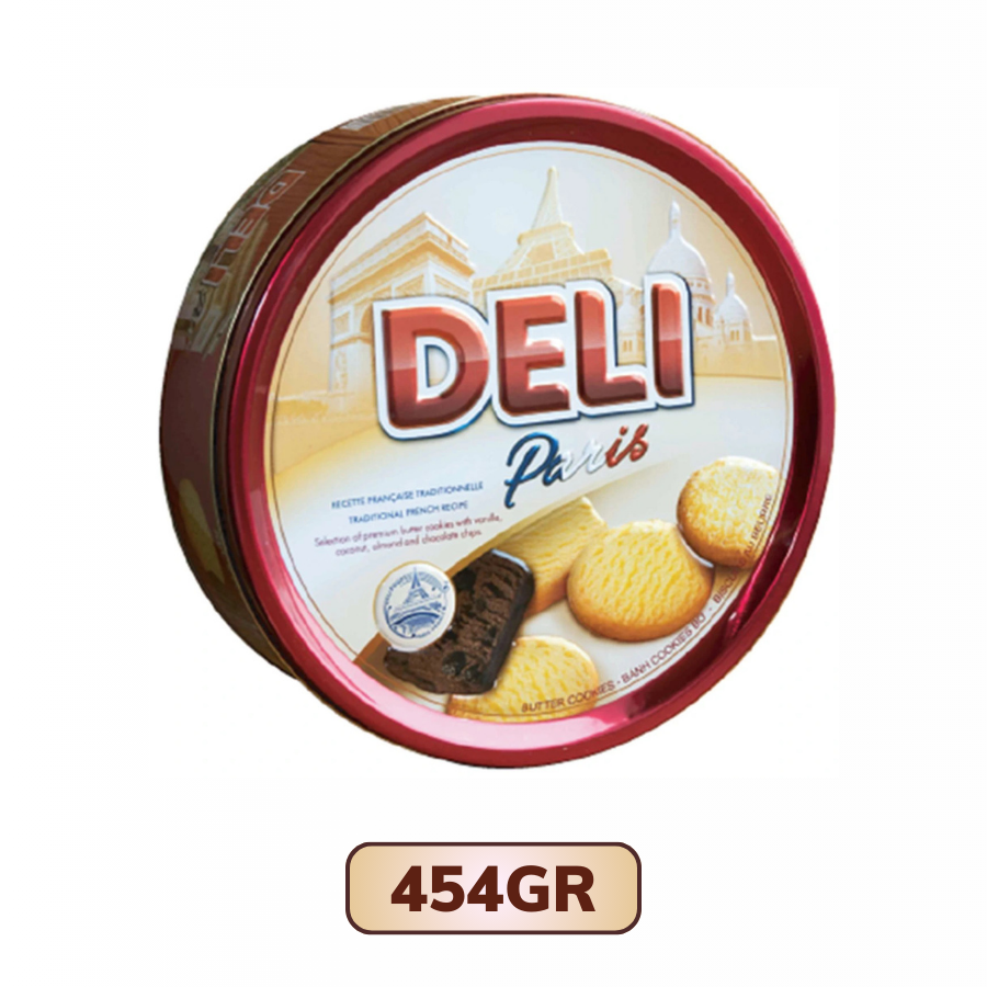 Bánh quy thơm ngon, vỏ bánh giòn rụm, thơm mùi bơ. Bánh quy bơ Deli Paris hộp 382g bao gồm 4 loại bánh quy: bánh quy dừa, bánh quy socola chip, bánh quy vani, bánh quy hạnh nhân. Bánh quy Deli thích hợp cho làm quà tết hoặc dịp lễ