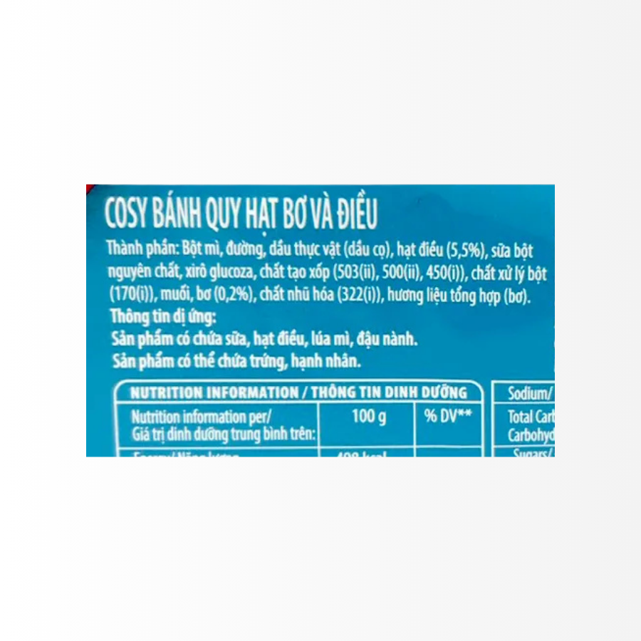 Bột mì, đường, dầu thực vật, hạt điều, sữa bột nguyên chất, chất tạo xốp, chất chống đông vón, chất nhũ hóa, muối bơ, hương liệu tổng hợp. |