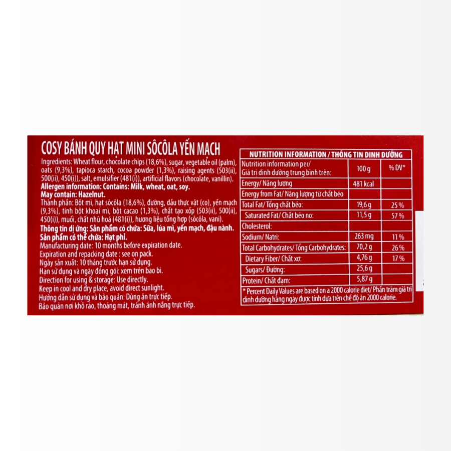Bột mì, hạt sôcôla (đường, chất béo và dầu thực vật hydro hóa (dầu hạt mỡ, dầu hạt cọ, dầu nhân cọ), bột cacao, cacao khối, hương tự nhiên và tổng hợp (vani), dextroza, chất nhũ hóa (492, 322(i))) (17,9%), đường, dầu thực vật không hydro hóa (dầu cọ), yến mạch, tinh bột khoai mì, bột cacao (1,5%), chất tạo xốp (503(ii), 500(ii)), muối, chất nhũ hóa (481(i)), hương tổng hợp (sôcôla, vani).