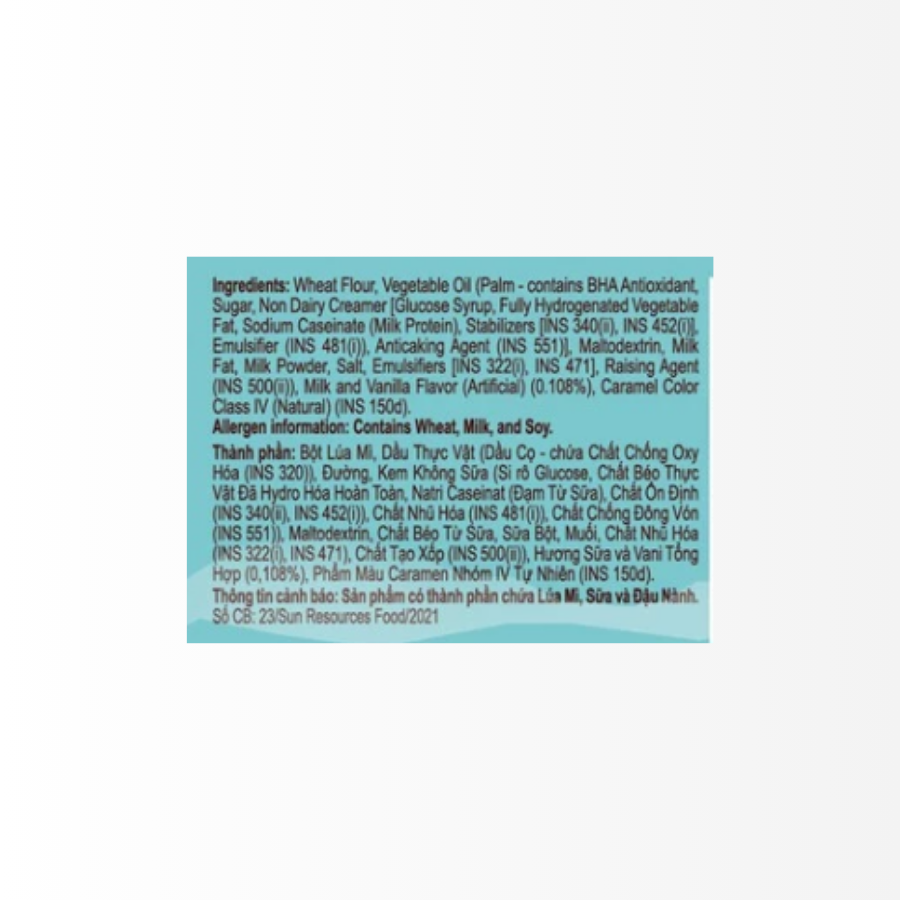 Thành phần: Bột lúa mì, dầu thực vật, đường, kem không sữa, chất nhũ hoá, muối, chất tạo xốp, hương Vanila, bơ, đường, phẩm màu tổng hợp,..