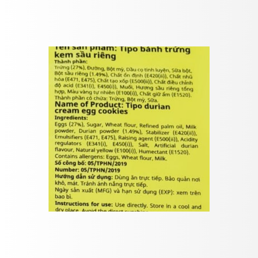 Thành phần: Trứng, đường, bột mì, dầu cọ tinh luyện, sữa bột, bột riêng, chất ổn định, chất nền hóa, chất tạo than, chất điều chỉnh độ axit, muối, hương liệu tổng hợp (sầu riêng), chất tạo màu tự nhiên, chất làm ẩm