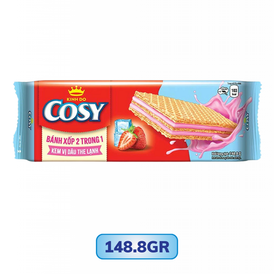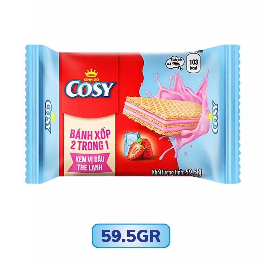 Bánh xốp 2 trong 1 kem vị dâu the lạnh Cosy gói 59.5g là loại bánh xốp nhân kem vị dâu the lạnh, hương vị bánh thơm, mát lạnh và ngọt vừa hấp dẫn vị giác. Bánh xốp Cosy là thương hiệu được yêu thích với nhiều loại bánh giòn thơm cực lôi cuốn.