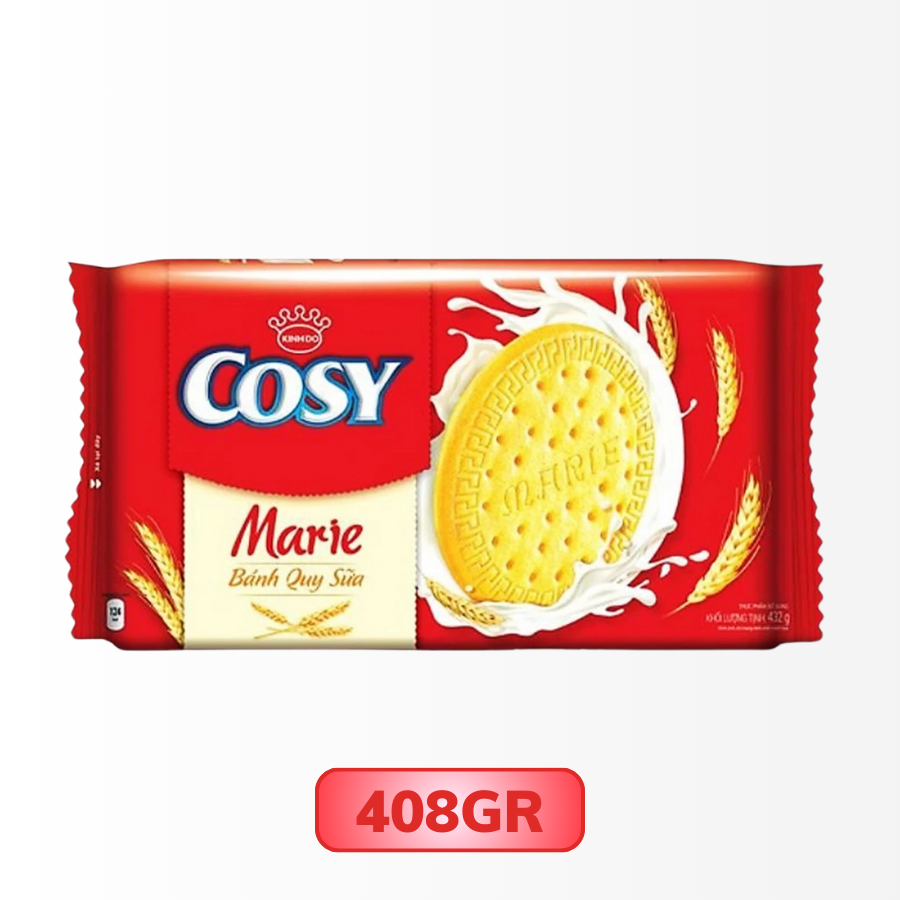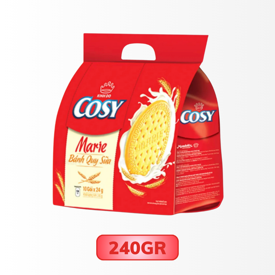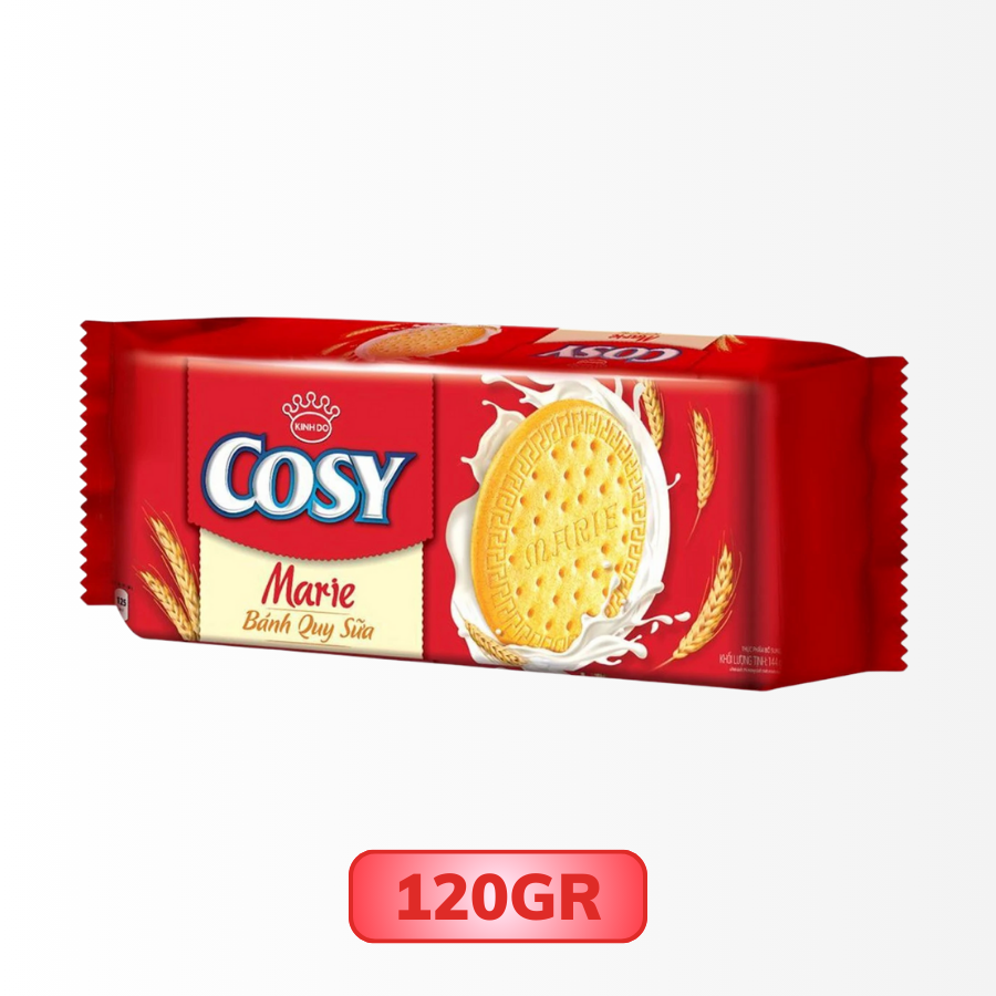Bánh quy sữa Cosy Marie có độ giòn xốp và thơm mùi sữa do sử dụng loại bột sữa và hương sữa được chế biến theo công nghệ hiện đại, đây là một món ăn nhẹ giúp bổ sung các vi chất dinh dưỡng với vị ngọt dịu, thơm ngon. Sản phẩm đồng thời cung cấp Canxi giúp tăng cường hệ răng và xương cùng với DHA tăng cường khả năng tư duy.