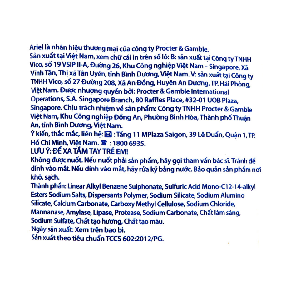 Thành phần: Sodium Sulfate, Sodium Linear Alkybenzene Sulfonate, Sodium Lauryl Sulfate, Carboxy Methyl Cellulose, Dispersants Polymer, Sodium Aluminosilicate, Silicate, Sodium Carbonate, Enzymes, Chất tạo hương