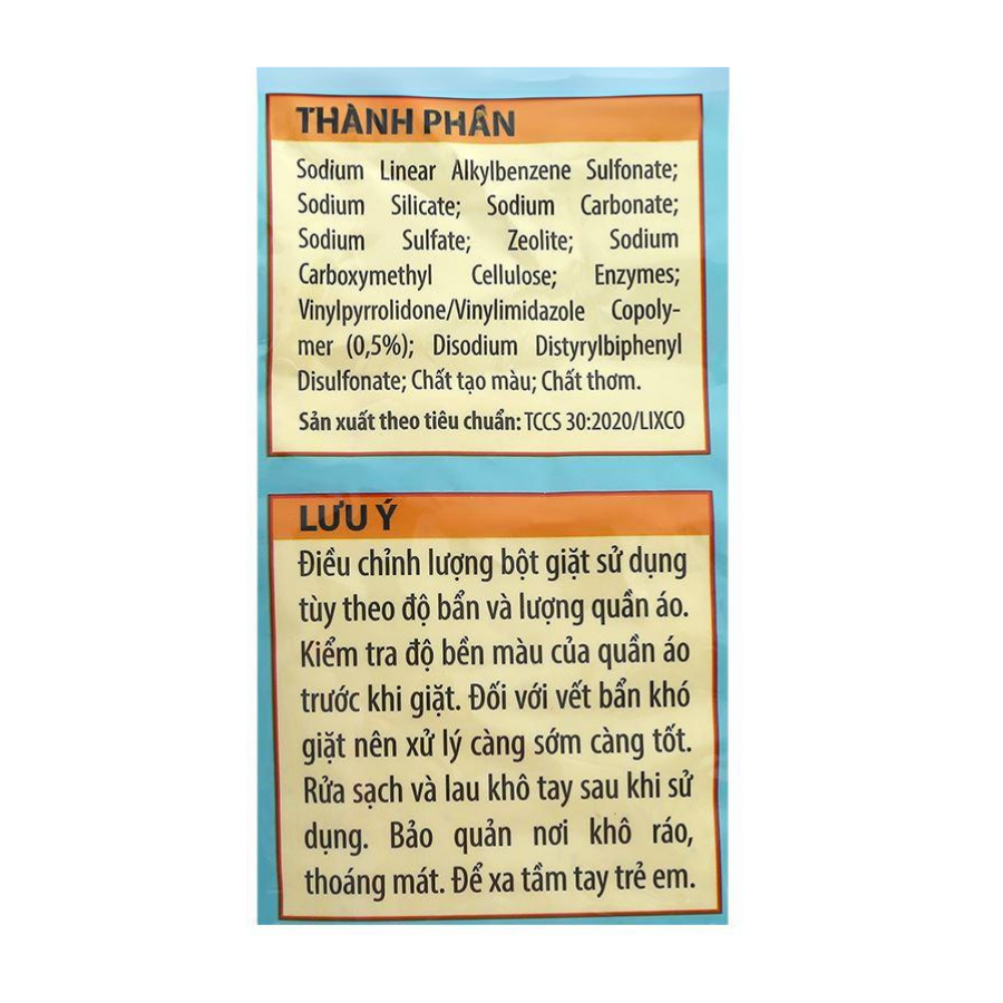 - Hướng dẫn sử dụng: Đối với giặt tay hòa tan một muỗng bột giặt trong 3-4 lít nước. Ngâm quần áo trong 30 phút để đạt hiệu quả cao nhất. Xả nước 2 - 3 lần sau khi giặt. Đối với giặt máy dùng 2 muỗng (80g) bột giặt cho mỗi lần giặt. Có thể điều chỉnh theo độ và lượng của quần áo. Để chế độ ngâm nếu quần áo bị dơ nhiều