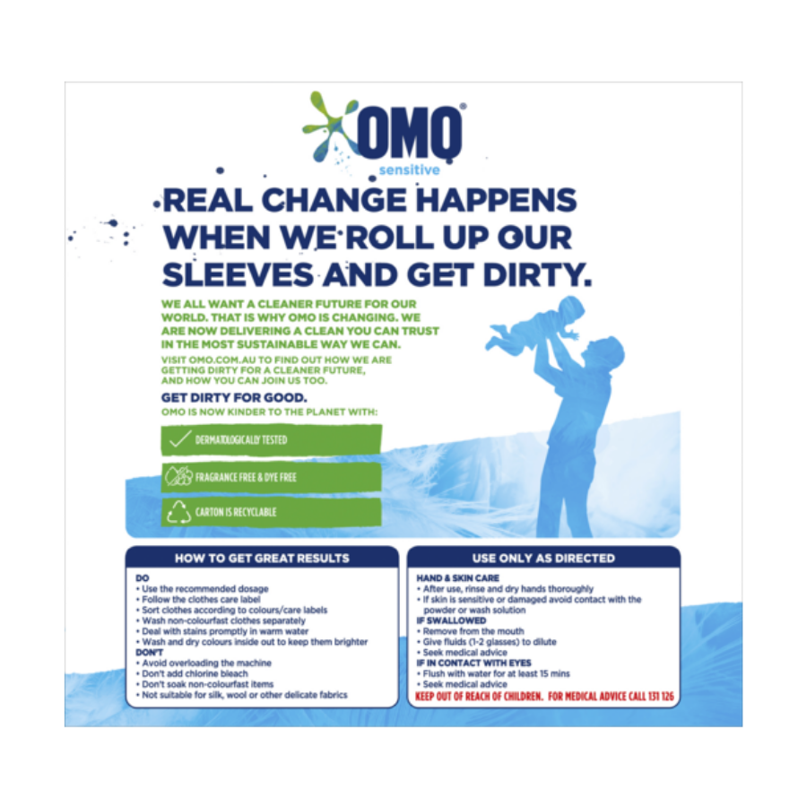 Bột giặt OMO đánh bay vết bẩn ngay từ lần giặt đầu tiên, với các chất tẩy vết bẩn có nguồn gốc tự nhiên và enzyme phân hủy sinh học giúp loại bỏ vết bẩn hiệu quả trong mỗi lần giặt. Bao bì của chúng tôi cũng có thể tái chế 100% với một muỗng sinh thái phân hủy sinh học. OMO là thương hiệu được các nhà sản xuất khuyên dùng hàng đầu cho cả máy giặt cửa trước và cửa trên. Nước giặt của chúng tôi đã được trao giải thưởng Thương hiệu đáng tin cậy nhất của Reader's Digest trong chín năm liên tiếp. Sự công nhận này nhấn mạnh cam kết vững chắc của chúng tôi trong việc thực hiện các cam kết và duy trì niềm tin của khách hàng trung thành. OMO có đầy đủ các sản phẩm giặt giũ phù hợp với mọi nhu cầu, bao gồm nước giặt OMO và viên giặt 3 trong 1 tiện lợi. Sử dụng OMO Sensitive để có công thức tẩy sạch vết bẩn nhưng vẫn dịu nhẹ với da hoặc OMO Fragrance để có cảm giác tươi mát lấy cảm hứng từ Comfort. OMO tin rằng sự thay đổi thực sự sẽ xảy ra khi chúng ta xắn tay áo lên và lao vào làm việc. Tất cả chúng ta đều mong muốn một tương lai sạch sẽ hơn cho thế giới của mình. Đó là lý do tại sao OMO đang thay đổi. Giờ đây, chúng tôi đang mang đến sự sạch sẽ mà bạn có thể tin tưởng theo cách bền vững nhất có thể. Truy cập trang web OMO để tìm hiểu cách chúng tôi chung tay vì một tương lai sạch đẹp hơn, và cách bạn cũng có thể tham gia cùng chúng tôi. Chung tay vì một tương lai tốt đẹp
