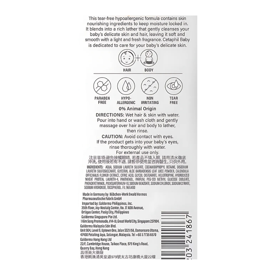 Sữa tắm gội toàn thân Cetaphil Baby Gentle Wash & Shampoo 2 in 1 chống kích ứng, sát khuẩn, chống viêm và làm lành da, chống lại các triệu chứng nổi mẩn đỏ, rôm sảy, ngứa ngáy và hăm.