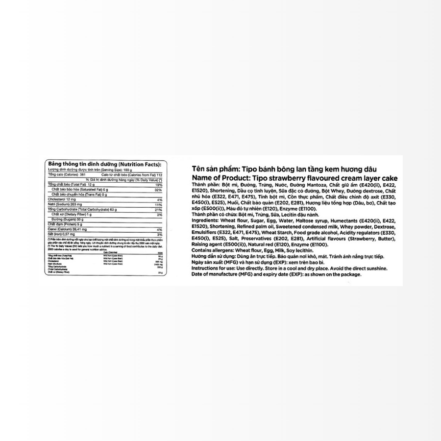 - Thành phần: Bột mì, đường, trứng, bột dâu, sữa bột, dầu thực vật,…