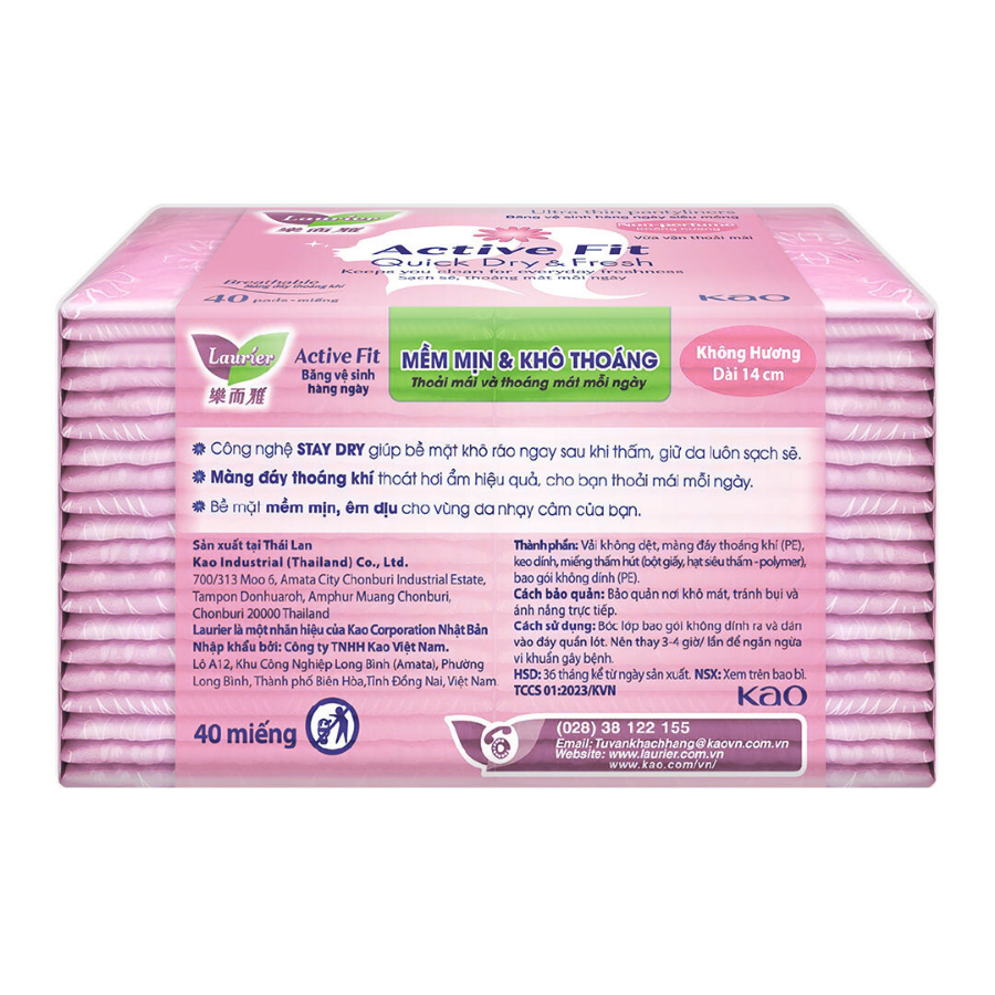 - Băng vệ sinh hàng ngày hương hoa Laurier Active Fit Quick Dry & Fresh Laurier Nhật Bản thấm hút cực nhanh, giúp bề mặt luôn khô thoáng, dễ chịu.