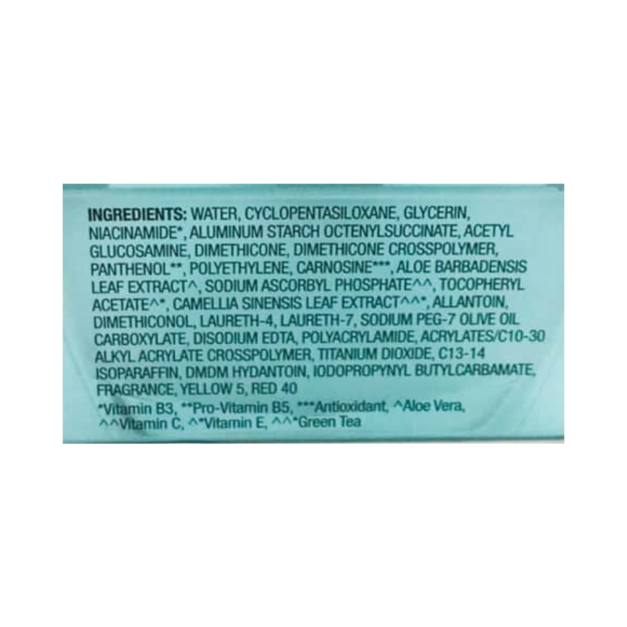water, vinyl dimethicone/methicone silsesquioxane crosspolymer, glycerin, niacinamide, isohexadecane, isopropyl isostearate, panthenol, camellia sinensis leaf extract, dimethicone, stearyl alcohol, sodium polyacrylate starch cetyl alcohol, caprylyl glycol, 1,2-hexanediol, phenoxyethanol, inositol, behenyl alcohol, dimethiconol, peg-100 stearate, fragrance, cetearyl glucoside, cetearyl alcohol, stearic acid, palmitic acid, bht, disodium edta, zinc gluconate, magnesium aspartate, copper gluconate