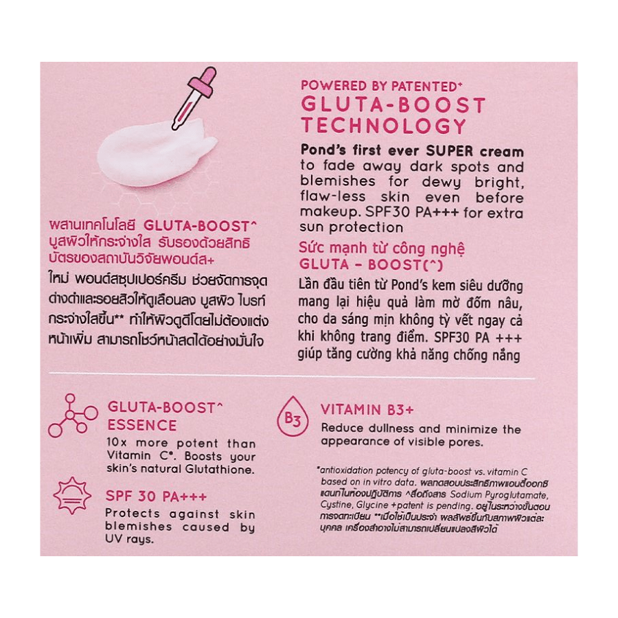 - Công nghệ Vitamin-Glutaboost chống oxy hoá mạnh mẽ và đem lại làn da trắng sáng mịn màng
