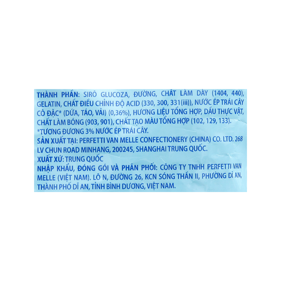 🔸 Thành phần: Si rô Glucoza, đường, chất làm dày (tinh bột xử lý chất oxy hóa (1404), Gelatin, chất điều chỉnh độ acid), chất làm bóng (sáp carnauba, sáp ong), hương cola tự nhiên, màu tự nhiên