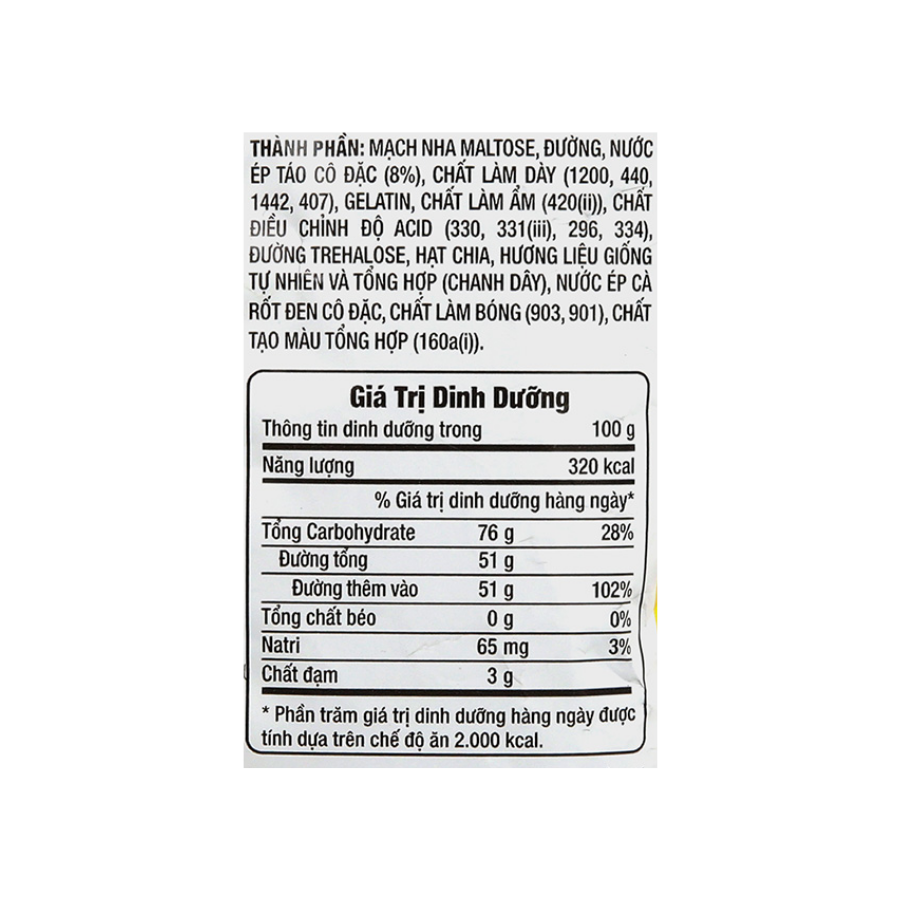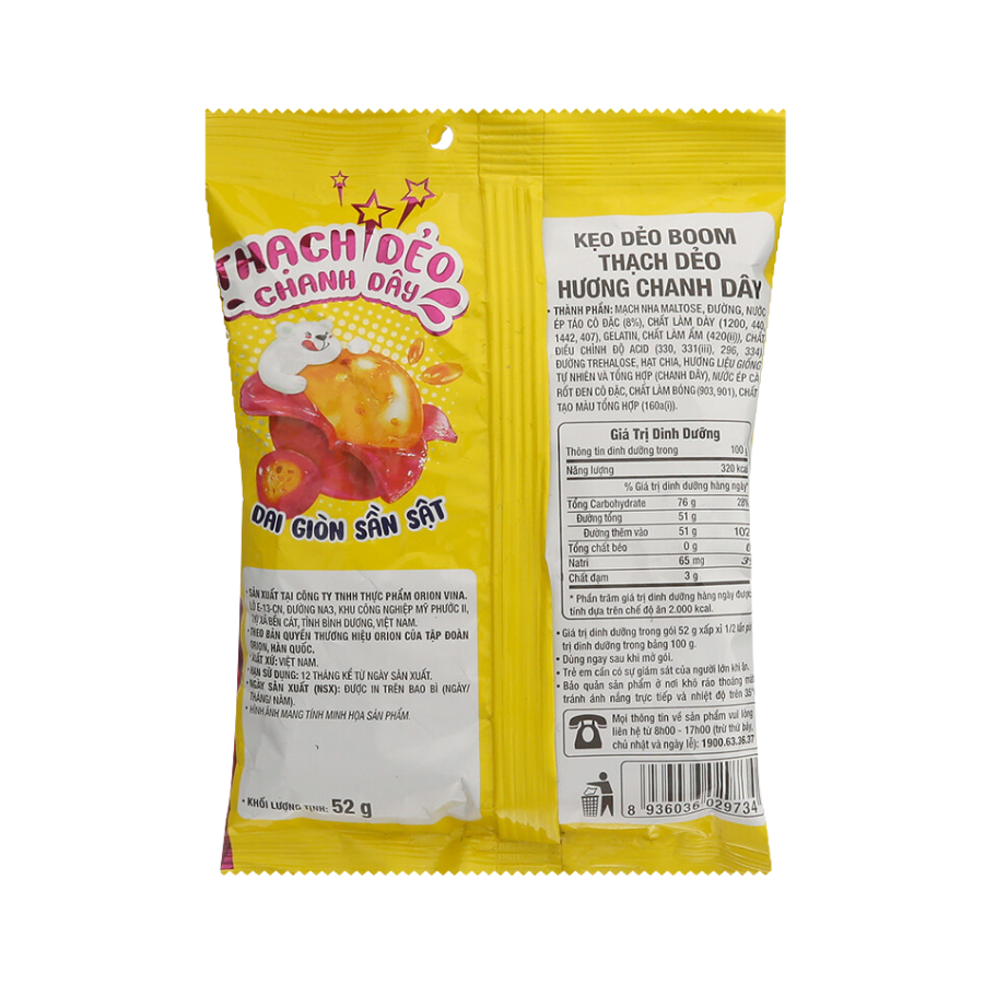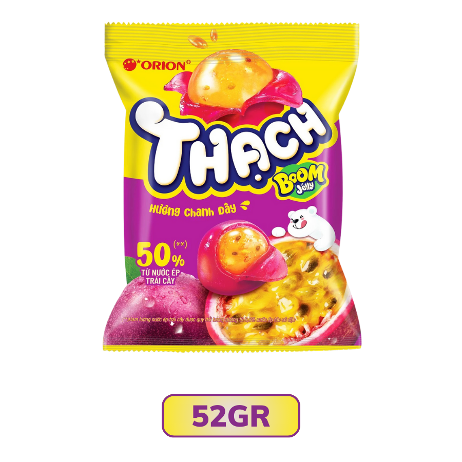 Kẹo Boom Jelly Thạch chanh dây là sản phẩm tiên phong trong dòng kẹo dẻo có nhân. Kẹo được tăng cường 50% nước trái cây thật, kết hợp chanh dây cùng hạt chia vô cùng hấp dẫn. Bên cạnh đó, cấu trúc 2 lớp kẹo lột độc đáo cũng sẽ mang lại trải nghiệm đầy mới mẻ cho các bé.