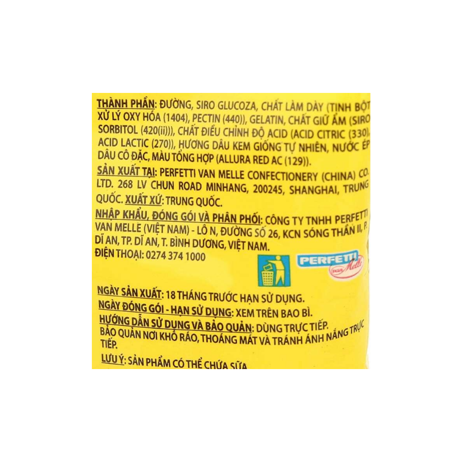 Thành phần: Đường, sirô glucoza, chất làm dầy (tinh bột xử lý oxy hoá 1404), pectin(440), gelatin, chất giữ ẩm (siro sorbitol (420(i)), chất điều chỉnh độ acid (acid citric(330)), hương dâu kem giống tự nhiên, nước ép dâu cô đặc, màu tổng hợp.