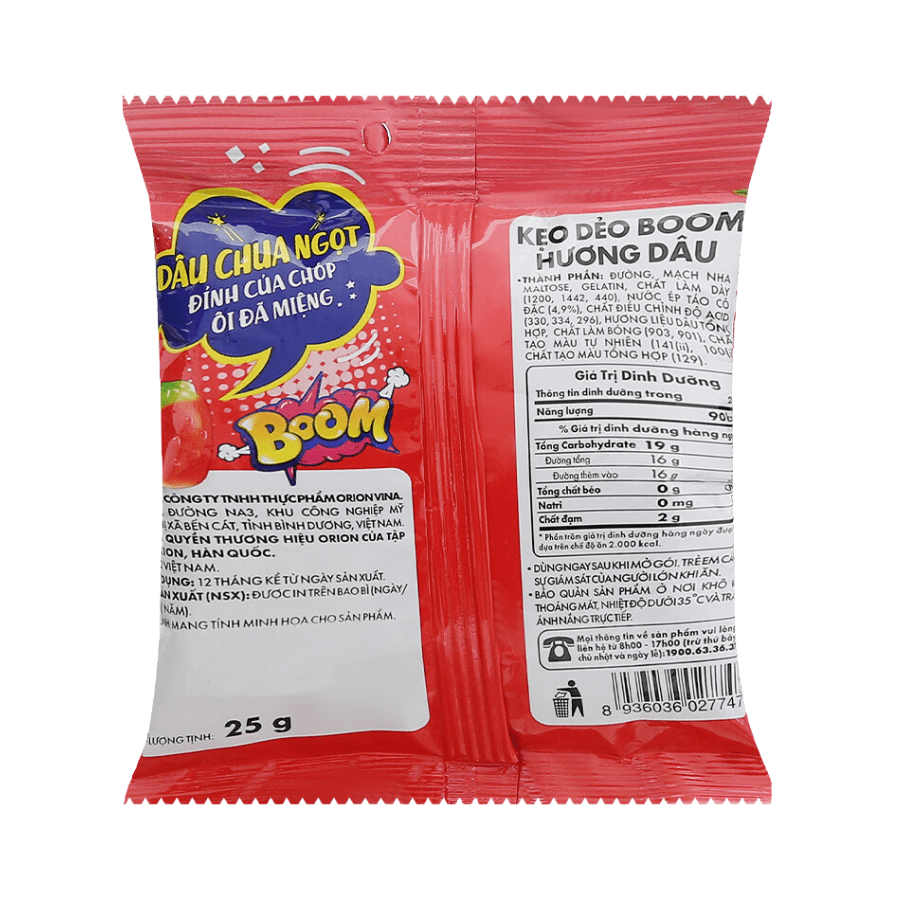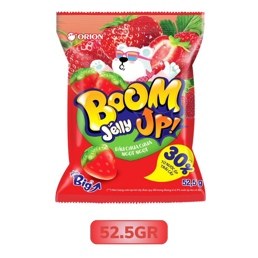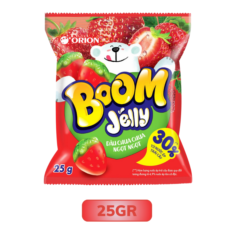 Là dòng kẹo đầu tiên của Orion được sản xuất tại Việt Nam. Kẹo dẻo BOOM được làm từ 30% trái cây thật, vị chua chua ngọt ngọt, hình dáng đào, dâu, nho đáng yêu, ngộ nghĩnh, được đánh giá là kẹo dẻo dai dai mềm mềm đúng ý thích của trẻ con Việt Nam.