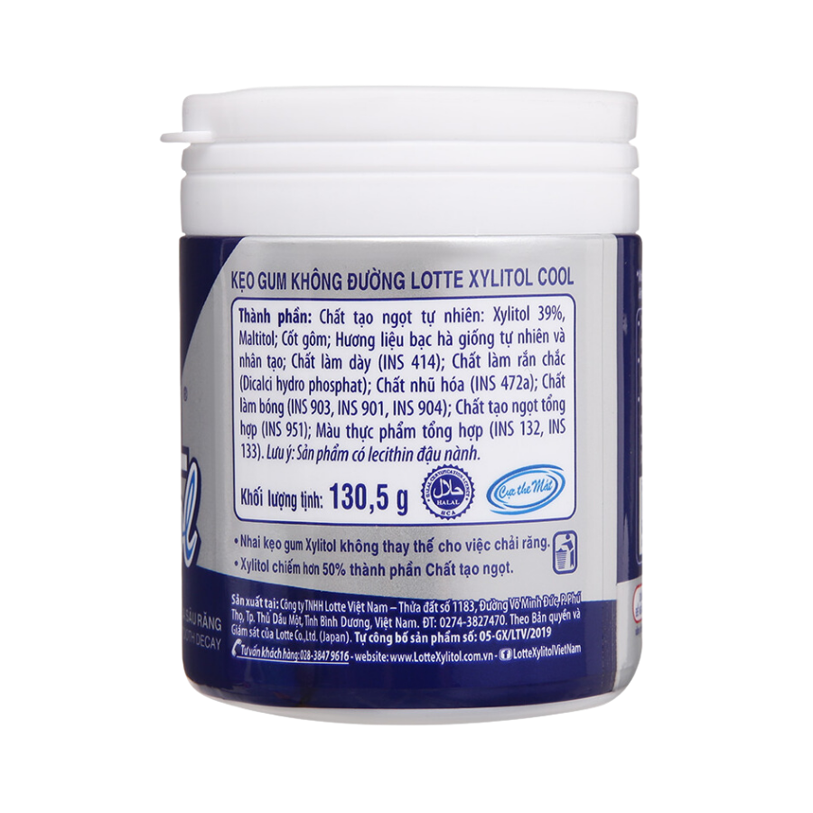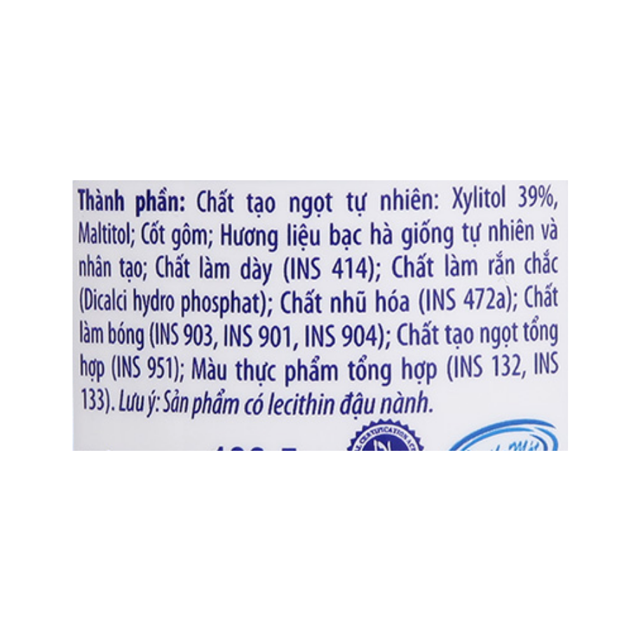 Thành phần: Xylitol 39%, Maltitol, Aspartam; Cốt gôm; Hương bạc hà giống tự nhiên và tổng hợp; Chất làm dày (414), Chất làm rắn (Dicanxi phosphat)...