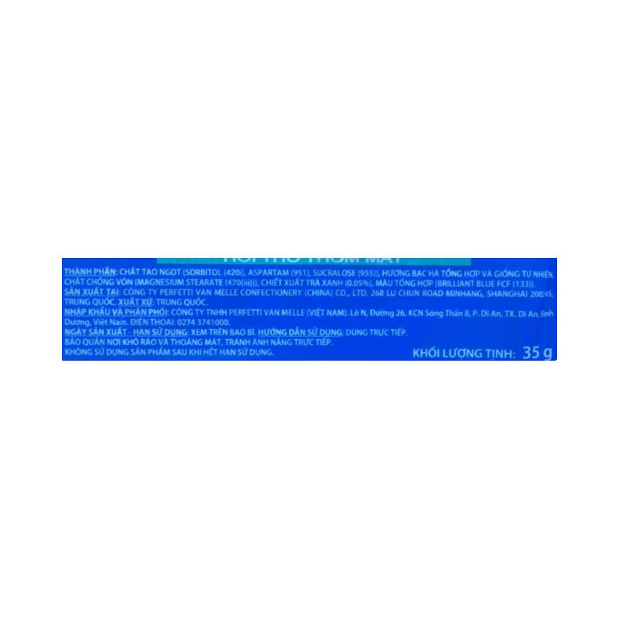 Chất tạo ngọt Sorbitol (420(i)), Aspartam (951), Sucralose (955), hương bạc hà giống tự nhiên và tổng hợp, chất chống vón Magnesium Stearate (470(b)), chiết xuất trà xanh (0.05%), mà tổng hợp và tự nhiên Brilliant Blue FCF (133).