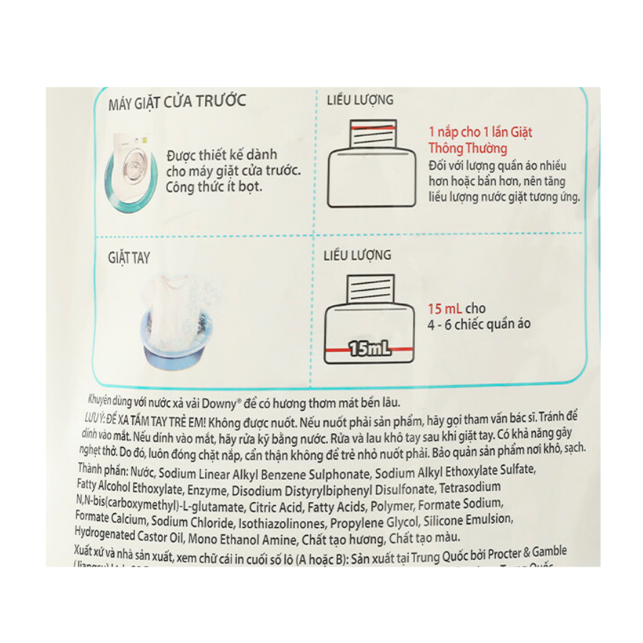 3. Đổ phần ARIEL CHUYÊN GIA CỬA TRƯỚC còn lại trong nắp vào máy giặt cửa trước cùng với quần áo. GIẶT MÁY LIỀU LƯỢNG 65 mL cho 1 lần Giặt Thông Thường (15-20 chiếc quần áo). Đối với lượng quần áo nhiều hơn hoặc bẩn hơn, nên tăng liều lượng nước giặt tương ứng thành 1.5 nắp. GIẶT TAY LIỀU LƯỢNG 15 mL cho 4 - 6 chiếc quần áo. Hãy rửa và lau khô tay sau khi sử dụng.