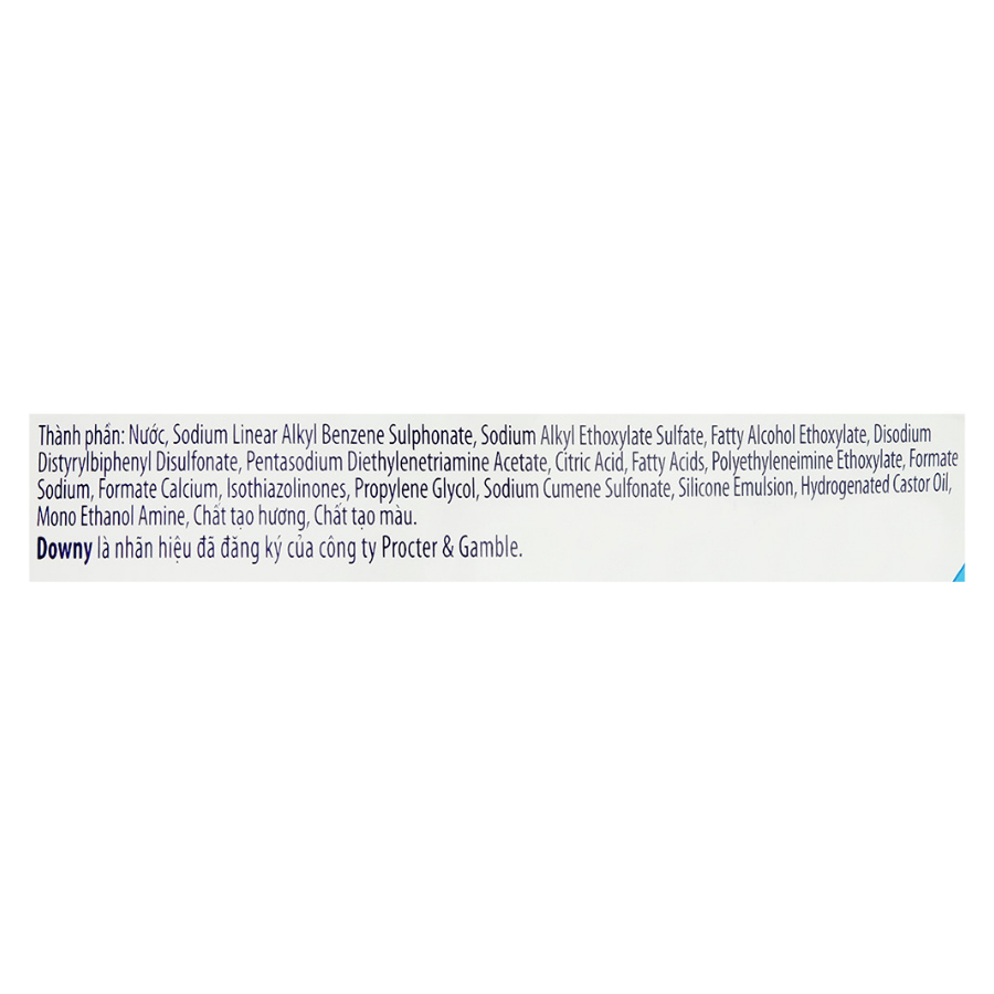 Nước, Sodium Linear Alkyl Benzene Sulphonate, Sodium Alkyl Ethoxylate Sulfate, Fatty Alcohol Ethoxylate, Enzyme, Disodium Distyrylbiphenyl Disulfonate, Pentasodium Diethylenetriamine Acetate, Citric Acid, Fatty Acids, Polyethyleneimine Ethoxylate, Formate Sodium, Formate Calcium, Isothiazolinones, Propylene Glycol, Sodium Cumene Sulfonate, Silicone Emulsion, Hydrogenated Castor Oil, Mono Ethanol Amine, Hương liệu, Thuốc nhuộm màu. |