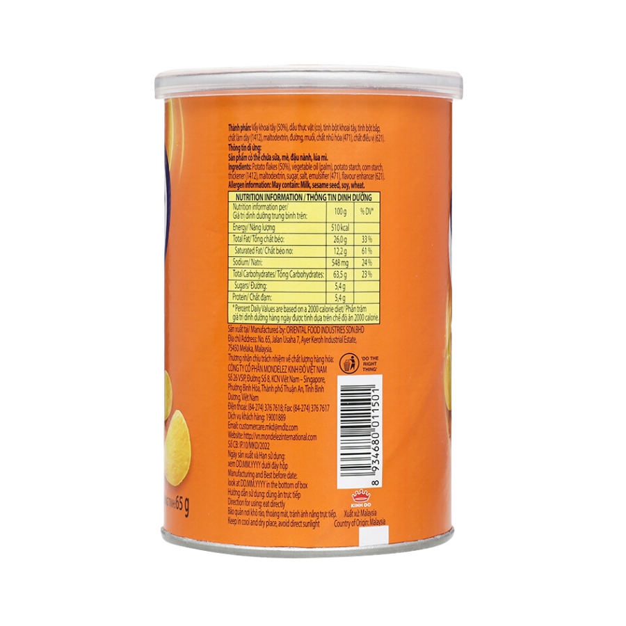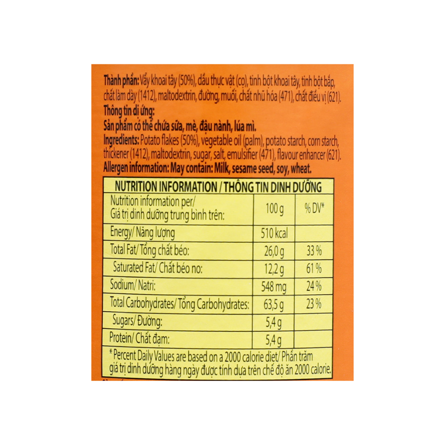 Khoai tây (70%), dầu thực vật (dầu cọ), tinh bột khoai tây, glucose, muối, đường, chất điều vị (monosodium glutamate (E621))