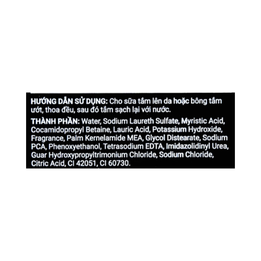| Hướng dẫn sử dụng | Bước 1: Cho một ít sữa tắm vào lòng bàn tay hay bông tắm. Bước 2: Tạo bọt và xoa đều lên da, rồi tắm sạch với nước. |