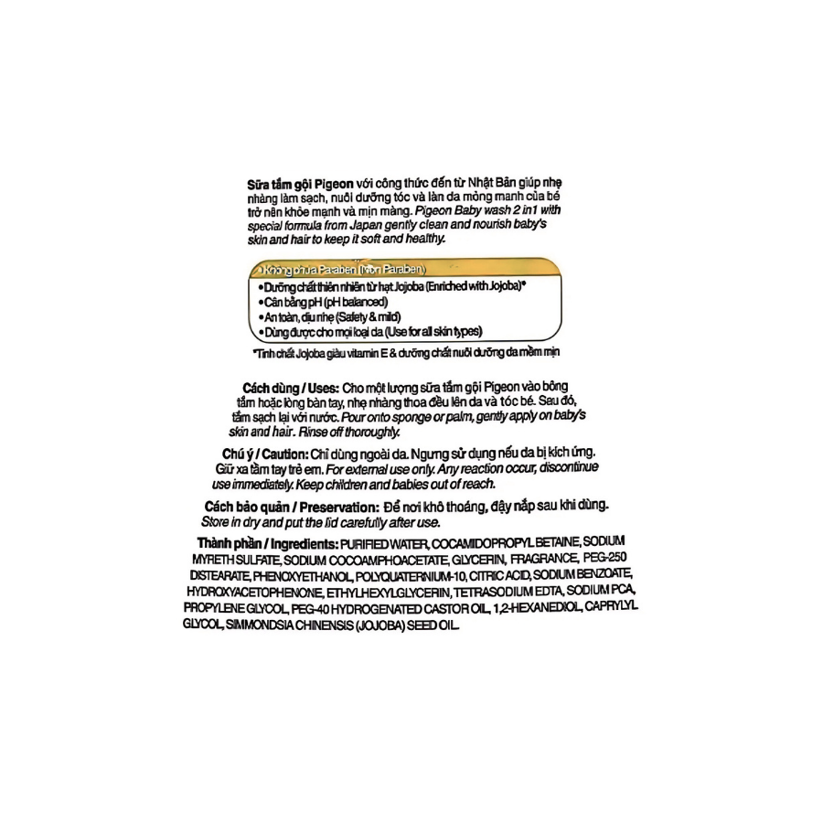 *Đặc Biệt tinh dầu Jojoba có tác dụng giữ ẩm hiệu quả, dễ dàng hấp thụ vào da dịu nhẹ cho da đầu nhạy cảm của bé.. Dầu gội dịu nhẹ Pigeon nhẹ nhàng gội sạch bụi bẩn bám trên tóc và da đầu nhạy cảm của bé với hương thơm dễ chịu. Sản phẩm có độ pH trung tính, cùng chiết xuất tinh dầu từ thiên nhiên Jojoba giữ cho tóc bé trông mềm mượt, không rối.