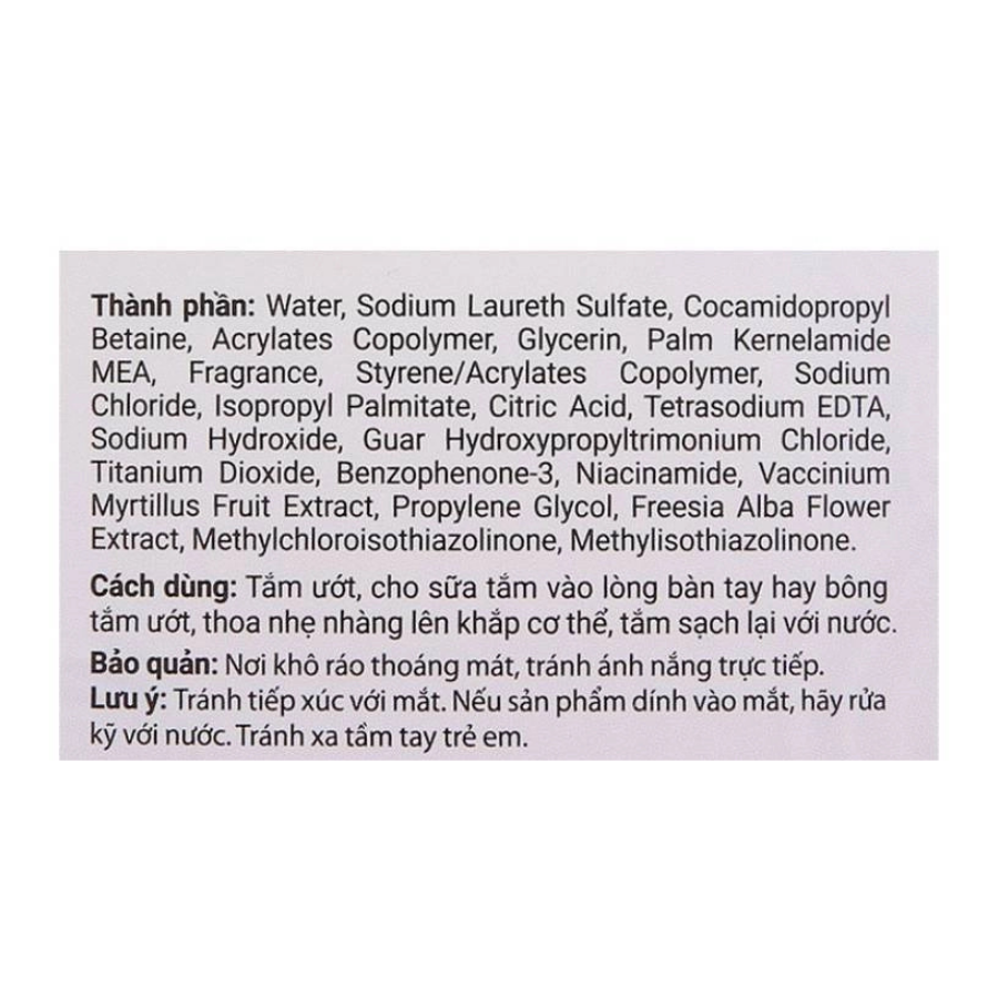 - Sữa tắm làm trắng da tăng cường các thành phần dưỡng da từ sữa dê và Vitamin B3, lưu lại hương thơm nước hoa ngọt ngào, thơm ngát.