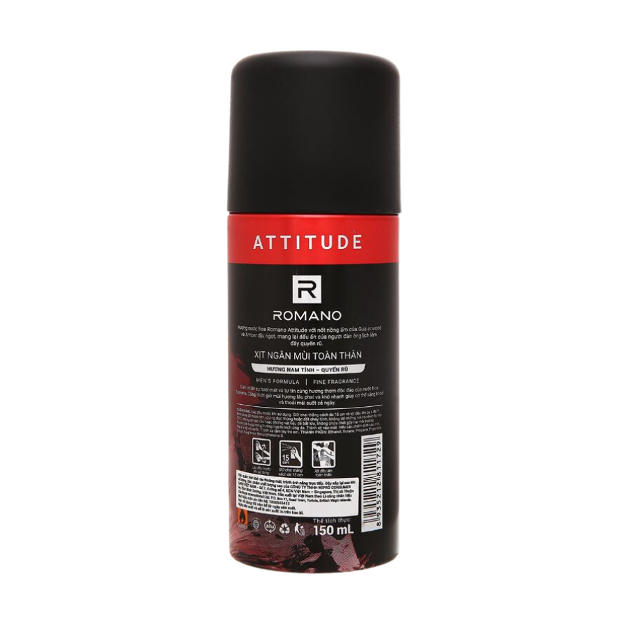 Xịt Khử Mùi Toàn Thân Cho Nam Romano Attitude (150ml) giúp ngăn mùi hiệu quả với hương thơm độc đáo của hương nước hoa Romano. Công thức đặc biệt giúp giữ mùi hương lâu, không chỉ tạo cảm giác thoải mái và tự tin suốt cả ngày mà còn giúp phái mạnh gây ấn tượng mạnh mẽ